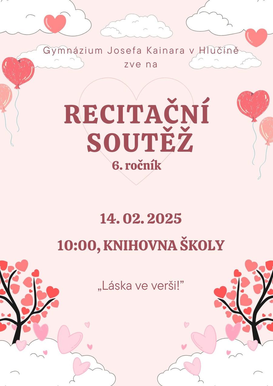 i letos proběhne tolik oblíbená recitační soutěž pro základní školy z okolí a naše žáky nižšího gymnázia. Protože letos padlo její konání na 14. února, rozhodli jsme ji i tematicky zaměřit, a proto jsme zvolili téma “Láska ve verši!”.
