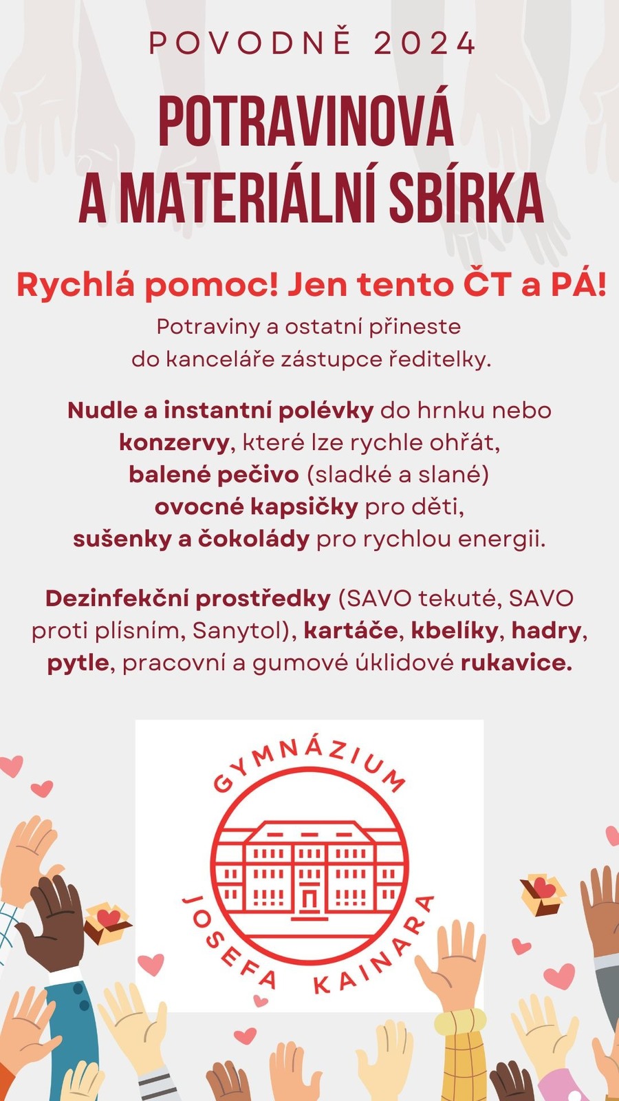 Potraviny a materiál můžete nosit maximálně do tohoto pátku 20. září 2024 (kancelář zástupce). Každá pomoc se počítá, neváhejte a zapojte se prosím ve velkém počtu!